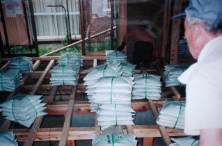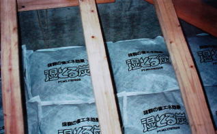 この粒体は、実験の結果、重量基準で最大約14%の水分吸着力を示した。例えば住宅の八畳間においての水分量は、気温28℃の場合、湿度50%で0.54kg、80%で 0.88kg含まれている。50%から80%の湿度変化に対して約0.02kg-H2O/kg-粒体の水分を吸着するので密閉した室内の床下に2.2kg入粒体、83袋を敷設すれば、除去すべき水分の約20倍の水分吸着能力を具備させることができる。また、乾燥時には適度な水分の放出があり、本粒体の敷設により居住空間の湿度調節が可能になるものと思われる。 |